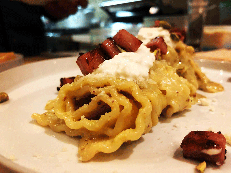 Allora partiamo dai vini, nella nostra carta sono presenti bottiglie esclusivamente italiane. Abbiamo una selezione che copre tutto il territorio, partiamo dal Trentino e finiamo in Calabria. Certo alcune hanno più referenze ma solo in base alla loro grandezza e varietà di territorio. Per esempio dai proprietari precedenti, che erano emiliani, abbiamo ereditato molte varietà di Sangiovese. Adesso abbiamo anche ampliato la nostra cantina, abbiamo deciso di puntare a dei vini un po’ più corposi come potrebbero essere certi vini del sud. Abbiamo fatto questa scelta soprattutto in base alla nostra clientela che preferisce e richiede questi gusti un po’ più forti. Poi, inoltre, prima del Covid organizzavamo dei workshop; nel nostro ristorante noi lavoriamo con la cucina aperta, a vista, perciò i clienti erano incuriositi dal vederci lavorare e hanno richiesto questo servizio. Classi piccole sulle 20 persone dove cercavamo di insegnare quanto più sulla pasta e le nostre tradizioni.