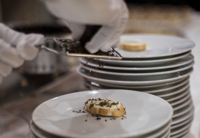 Il bello di quando ci esprimiamo nelle Cerimonie o nei Banchetti è che la gente possa assistere alla preparazione delle nostre specialità nelle sue varie fasi, dalla materia prima al piatto pronto da gustare. Le nostre pentole sono ad oscillazione. Usiamo quelle piccole per gli antipasti da buffet. Gli antipasti più richiesti sono la fonduta di Taleggio servita su crostini di pane e il Tartufo Nero. Le pentole grandi hanno diametri che variano dai 90 cm fino ai 120 cm che ci consentono di realizzare dalle 300 alle 380 porzioni di Pasta o Risotto in circa 40 minuti.