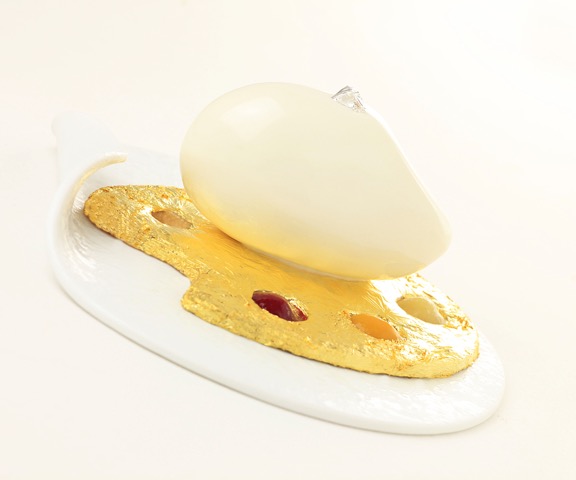 Composizione del dolce: Namelaka montata al lime, ragù di ananas e riso-latte profumato al timo limonato e maraschino, sablè al riso e germe di riso, glassa avorio perlata, tre salse di frutta